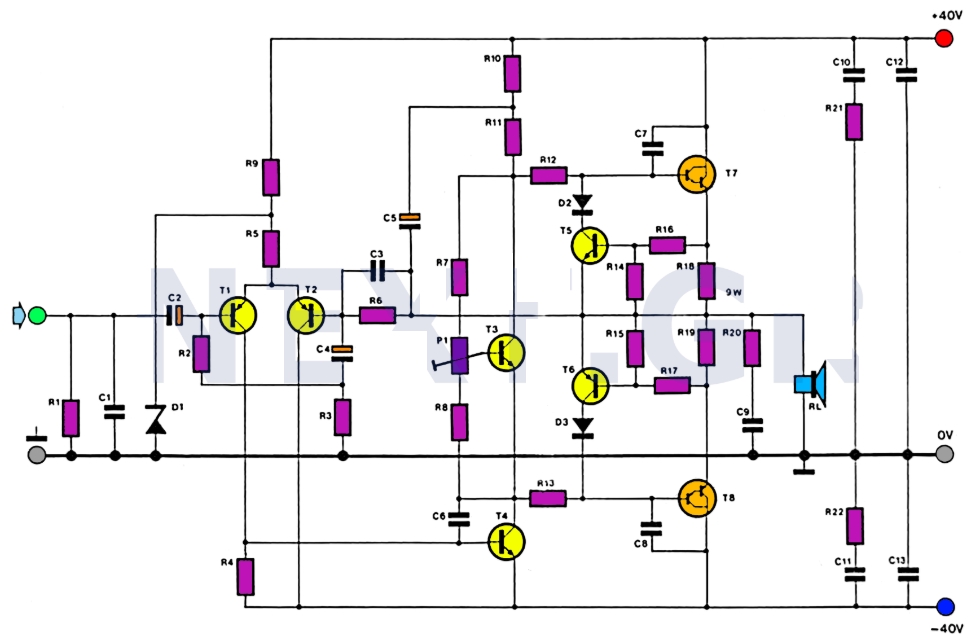 輸入級是一個差分放大器,其主要元件為晶體管T1和T2。然后我們有了T4的前置步驟,其集電極連接到T3發射極。這就像可調齊納二極管一樣工作,并調節靜態電流。最后一步是兩個完全互補的晶體管T7和T8(達靈頓)。