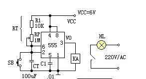 工作原理: 電源接通后,定時器進入穩態。此時定時電容CT的電壓為:VCT=VCC=6V。對555這個等效觸發器來講,兩個輸入都是高電平,即VS=0。繼電器KA不吸合,常開點是打開的,曝光照明燈HL不亮。