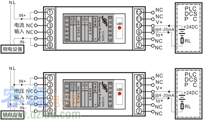 該模塊輸出是針對(duì)24VDC和取樣電阻(二線制儀表)相串聯(lián)的二線制供電回路來(lái)設(shè)計(jì)的,同當(dāng)前工業(yè)現(xiàn)場(chǎng)常用的模擬量輸入接口板(上位機(jī))、PLC、DCS或其他儀表的模擬量輸入端口相匹配。方案設(shè)計(jì)中選用了高效能的回路竊電技術(shù)而無(wú)需獨(dú)立電源供電,采用的兩線制回路供電輸出方式可省掉兩根電源線,大大簡(jiǎn)化了用戶的系統(tǒng)方案設(shè)計(jì),降低用戶布線成本。