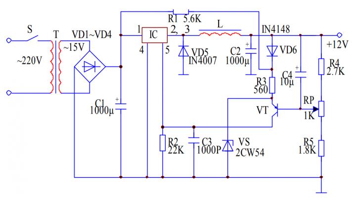 當(dāng)輸出電壓達(dá)到 6V 時(shí),穩(wěn)壓管 VS 擊穿,電阻器 R3 上的電流增加,導(dǎo)致 R3 上的電壓增加,當(dāng)輸出電壓達(dá)到 12V 時(shí),三極管 VT 從飽和狀態(tài)變?yōu)榉糯鬆顟B(tài)。當(dāng)輸出電壓超過 12V時(shí),三極管 VT 的發(fā)射結(jié)電壓降低,使得集電極輸出電壓下降,當(dāng)下降到 1.6V(即 IC 集成電路的 5 腳電位下降到 1.6V)時(shí),IC 開關(guān)集成電路斷開,電感器 L 的電流下降,輸出電壓也隨著下降,當(dāng)下降到 12V 時(shí),三極管 VT 的集電極電位上升為 1.6V 以上,IC 集成電路再次導(dǎo)通,使得輸出電壓始終穩(wěn)定在 12V。