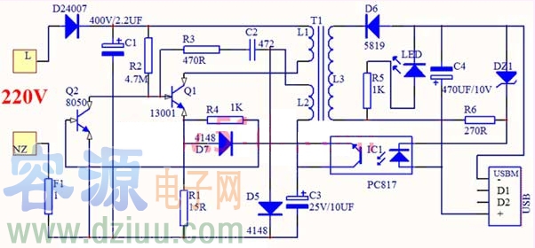 L3輸出電壓經D6整流、C4濾波后通過USB座給負載供電。LED1和R5組成輸出指示電路。DZ1、IC1、Q2等組成取樣比較電路,檢查輸出電壓的高低。當負載變輕或電源電壓升高等原因導致輸出電壓升高時,Z1擊穿,IC1中發光二級管電流增大,IC1中光敏三極管電流增大。L2反饋繞組中的感應電壓經IC1中的光敏三極管到Q2基極,Q2基極電流增大,集電極電流增大,Q1基極電流減小,集電極電流減小,負載能力變小,從而導致輸出電壓降低。當輸出電壓降低后,Q2取樣后又會截止,Q1的負載能力變強,輸出電壓升高,這樣起到自動穩壓作用。D5為L2繞組輸出電壓整流二極管,C3為濾波電容。