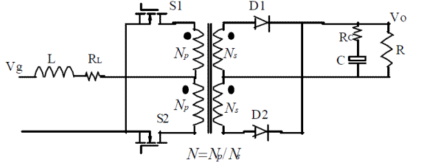 (1):對(duì)稱驅(qū)動(dòng)推挽Boost 變換器的電路圖: