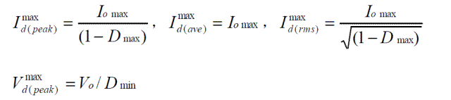 上述公式是穩態工作時,功率器件上的電壓、電流應力。選擇功率器件時,其電壓耐量可放一個合適的余量(保證最壞情況下的電壓峰值不超過此值),電流耐量則得按器件的結溫降額要求決定、它與外部散熱條件和器件的通態電阻、通態壓降、結電容、反向恢復、結到殼的熱阻等密切相關,是功率器件熱設計的內容