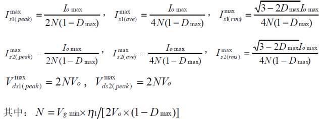 上述公式是穩態工作時,功率器件上的電壓、電流應力。選擇功率器件時,其電壓耐量可放一個合適的余量(保證最壞情況下的電壓峰值不超過此值),電流耐量則得按器件的結溫降額要求決定、它與外部散熱條件和器件的通態電阻、通態壓降、結電容、反向恢復、結到殼的熱阻等密切相關,是功率器件熱設計的內容,將在以后的欄目中介紹。