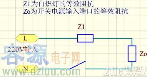 另外白熾燈還有一個特性就是熱態阻抗比冷態阻抗要大很多,實驗得出大概十多倍的樣子,在此我假設熱態阻抗是冷態阻抗的10倍。由于上電白熾燈上有較大的壓降和較大的電流會以非常快的速度發熱,設發熱后阻抗由Z1=100Ω變成Z1=1K,在很短的時間內會使Zo上的電壓變得非常小從而避免了開關電源炸機。