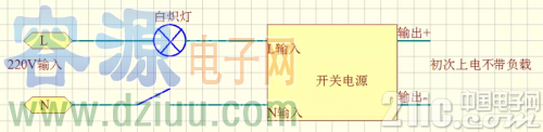 方法很簡單,就是在開關電源輸入線上串聯一個白熾燈來做保護,如下圖。