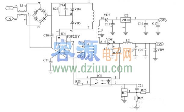 。其核心器件TOP221,三端高壓開關集成電路,其內部集成有電壓型脈寬調制振蕩器、基準電壓源、誤差放大器、高壓啟動限流電阻以及過熱等保護電路。此外在芯片上還集成有耐壓溝道功率場效應晶體管,驅動功耗小。