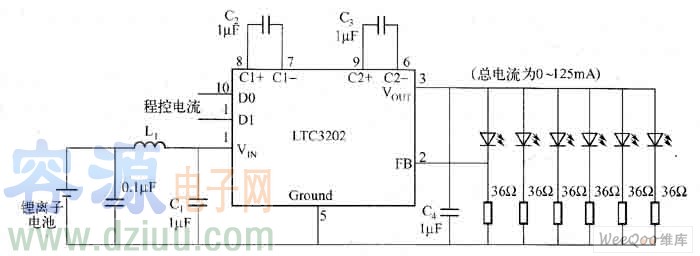 圖 采用LTC3202電荷泵的鋰離子電池供電驅動白光LED電路容源電子網www.6600560.cn
