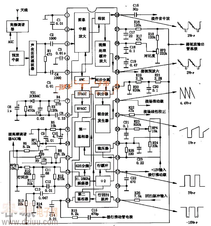 MCI3007是美國摩托羅拉(MOTOROLA)公司生產的、采用先進的氮化工藝和數字分頻技術的大規模單片集成電路。其內部包含了200個線性電路和200個邏輯門電路,可用來完成除伴音信號以外的所有小信號處理電路。它包括:中