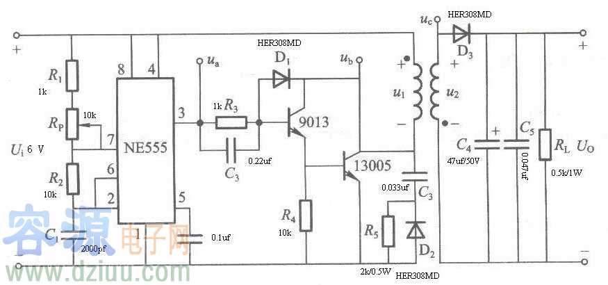 13005逆變電路圖:逆變器電路圖有很多種,采用不同的控制方式可以得到不同的電路及輸出功率及頻率,本文介紹的是用13005逆變電路圖,13005主要作用是功率開關(guān)管,13005決定輸出的功率(一般制作逆變器都希望輸出功率大更好)。電路前級(jí)主要是用NE555及13005控制,后級(jí)很簡單,就是整流加濾波得到直流電源。13005逆變電路圖如下: