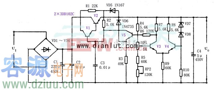 下面是 [實用高壓直流穩壓電源電路]的電路圖 實用高壓直流穩壓電源電路 在實際生產應用中,在許多場合都要求有長期穩定的高壓直流電源,并且有時希望輸出電壓是可凋的。—般的