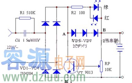 充電時,綠色發光二極管VLi亮;電池充足后,紅色發光二極管VLz亮。