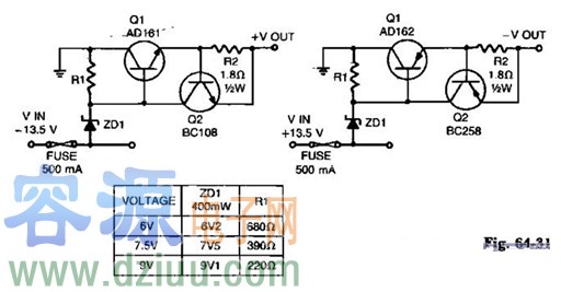 低電壓調(diào)節(jié)器短路保護(hù)電路,可提供6,7.5,和9 V從13.5 V標(biāo)稱值,然而,他們將功能一樣好,如果連接到一個平滑的直流輸出變壓器/整流電路的汽車電池供電。 兩種類型的正反兩方面的地面系