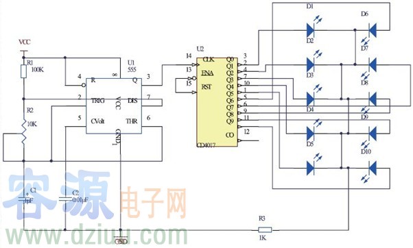 一款實用的LED流水燈電路圖(CD4017)