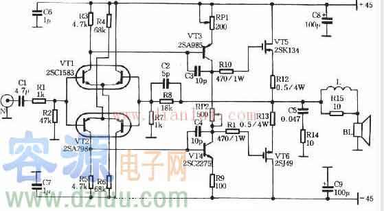 一臺既吸收電子管的“樂感”優勢,又具有晶體管使用方便特點的晶體機,全機主角為Q1N-MOSFETIRFP140,由于是接成單級的增益放大,故為反相輸出,輸出端是喇叭的負端,而接地點才是正端。另外有一顆P-MOSFETQ2