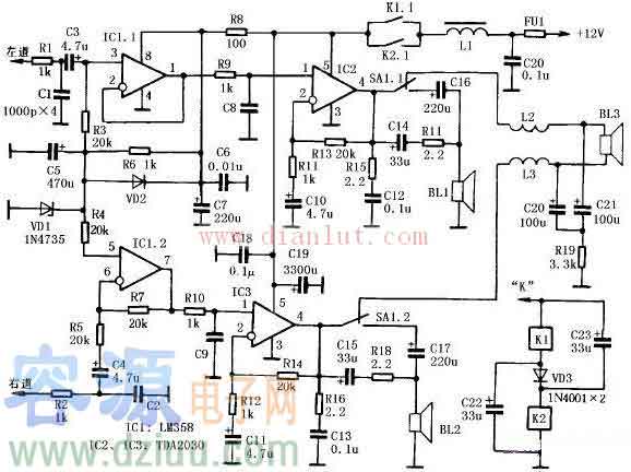 本電路設計的音頻功率放大器高質量低花費,不僅可用于汽車上,也可用于小型便攜式音樂中心。該功率放大器是低通道沒有附加另外的放大器,低頻通道的揚聲器經濾波器接到二個立體聲通道的輸出端,其中一個信號反