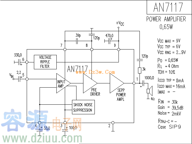 下面是采用AN7117功放應用電路圖。 功放參數如下: 功作電壓:直流2V-9V 輸出功率:0.65W 負載:4 Ohm TDH=10% 增益:39.5dB :