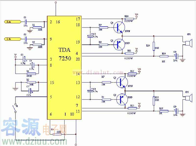 在自制功放電路時,最頭痛的問題莫過于差分電路的晶體管配對和調零漂,一個不小心還把功放管給沖了……現在好了可以試一試TDA7250。 TDA7250為SGS-THOMSON公司出品的一款功放驅動IC,它的特性如下;外圍電路
