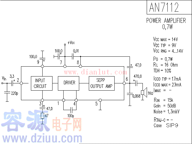 AN7112實現0.5W單聲道OTL功率放大的電路