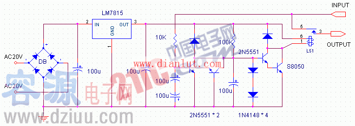 本電路輸入為20V的交流電,經過整流二極管和濾波電容后輸出為直流電壓,再經過穩壓芯片LM7815輸出為穩定電壓15V供放大電路作電源使用。放大電路利用三極管的放大特性,將小信號放大,構成耳放放大電路。 :