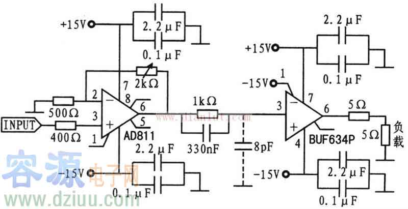 本電路應用AD811與BUF634P結成功放電路;通過電路圖可以看到是正負15V供電,效果很好。功率放大器,簡稱“功放”。很多情況下主機的額定輸出功率不能勝任帶動整個音響系統的任務,這時就要在主機和播放設備之間加裝功率放大器來補充所需的功率缺口。。