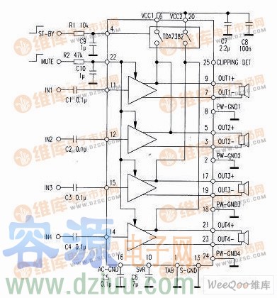 TDA7382 是意法半導體公司新推出不久的汽車用 AB 類功放集成電路,它采用 25 腳單列FLEXIW ATT 封裝。內有 4 路22W PNP/NPN 互補晶體管構成的橋式 AB 類音頻功率放大器,是高檔汽車理想的多聲道功放集成電路,