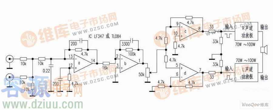 LF353的應用電路圖之D類低音功放