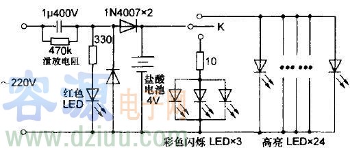 220V交流市電經電容降壓、二極管整流后給鉛酸蓄電池充電,紅色LED作充電指示。充好電后使用時閉合按鈕開關K,將首先接通3顆彩色閃爍LED,發出夢幻般變化莫測的七彩光芒,在夜間平添一些生活樂趣,再按一下開關K則關