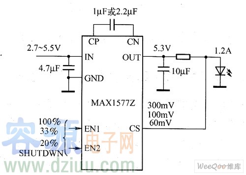 MAX1577/MAX1577Z電荷泵適用于驅動大功率白光LED,如相機閃光燈,其調節電流最大為1.2A(確保800mA)。即使電池輸入電壓很低,其極低的開環阻抗仍可以保證很高的閃光亮度。其自適應1倍壓模式、2倍壓模式的工作方